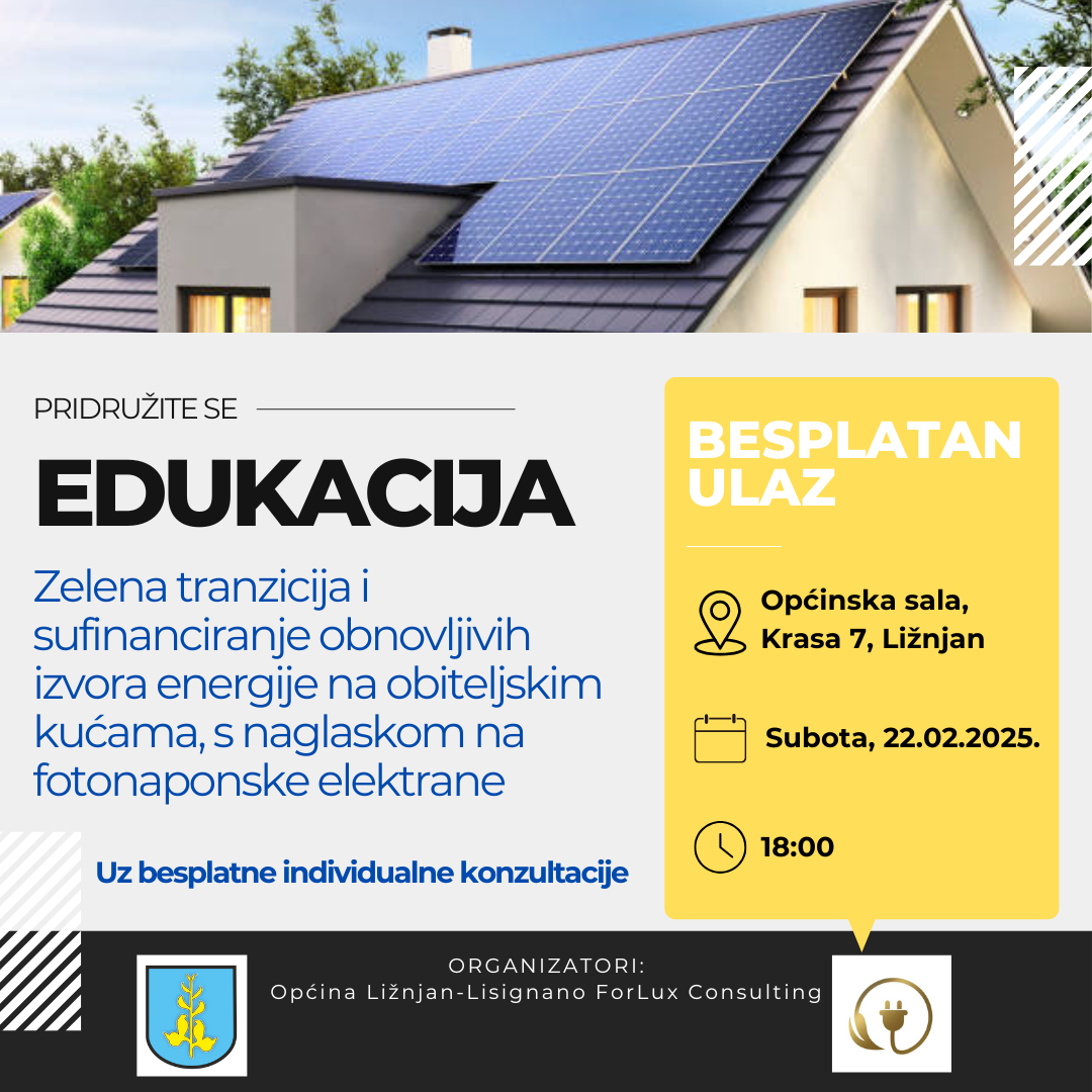 Besplatna edukacija za mještane pod nazivom „Zelena tranzicija i sufinanciranje fotonaponskih elektrana te energetske obnove na obiteljskim kućama“ održat će se u subotu, 22. veljače 2025. godine u 18:00 sati, u Općinskoj sali, Krasa 7, u organizaciji Općine Ližnjan-Lisignano i ForLux Consultinga.